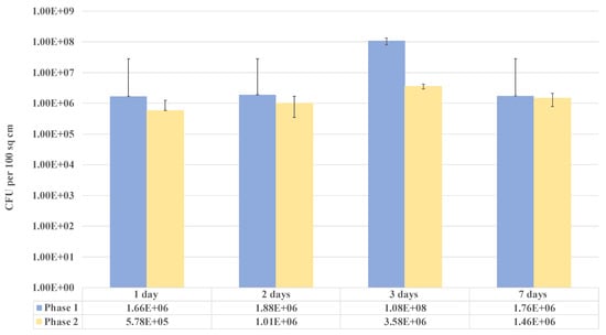 Heterotrophic bacterial counts (colony-forming units, CFU) per 100 cm2 surface area per day during Phase 1 cleaning (use of toilet bowl cleaner only) and Phase 2 cleaning (bundling of multiple products for multiple surfaces) (see Supplemental Materials Table S1 for individual site numerical data). A significant difference (p = 0.009) was observed for the every-3-day (twice a week) cleaning between the Phase 1 and Phase 2 results.