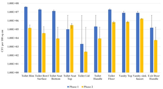 Heterotrophic bacteria average counts (colony-forming units, CFU) per 100 cm2 surface area per site for the every-3-day Phase 1 cleaning (use of toilet bowl cleaner only) and Phase 2 cleaning (bundling of multiple products for multiple surfaces) (see Supplemental Materials Table S1 for individual site numerical data). A significant difference (p = 0.009) was observed in the pooled data from all surfaces for the every-3-day (twice a week) cleaning/disinfecting for Phase 1 vs. Phase 2.