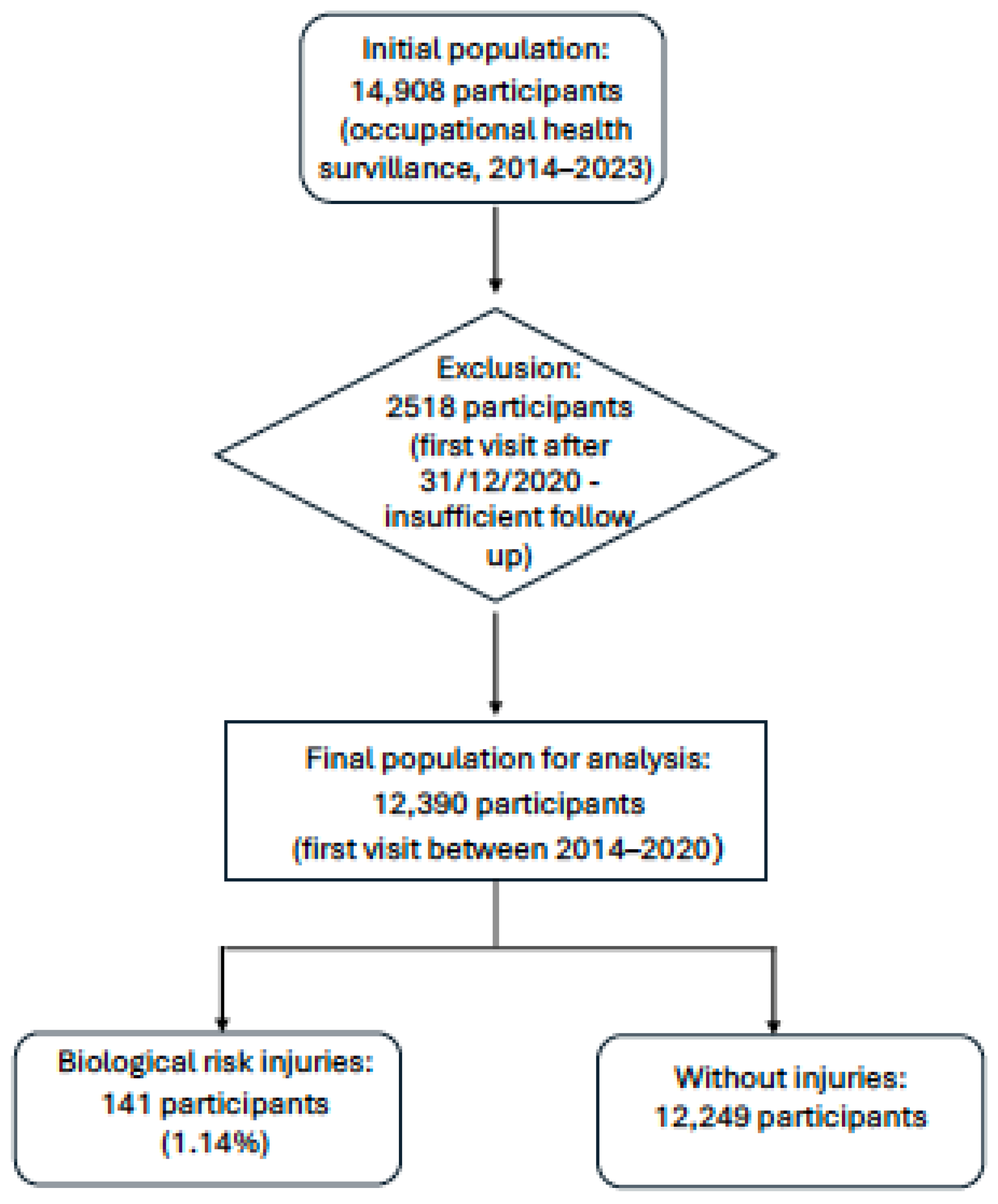 Figure 1 shows the number of participants at each stage of the study and the reasons for exclusion. Out of 14,908 participants, 141 sustained biological risk injuries. Missing data were minimal and did not impact the final analysis.