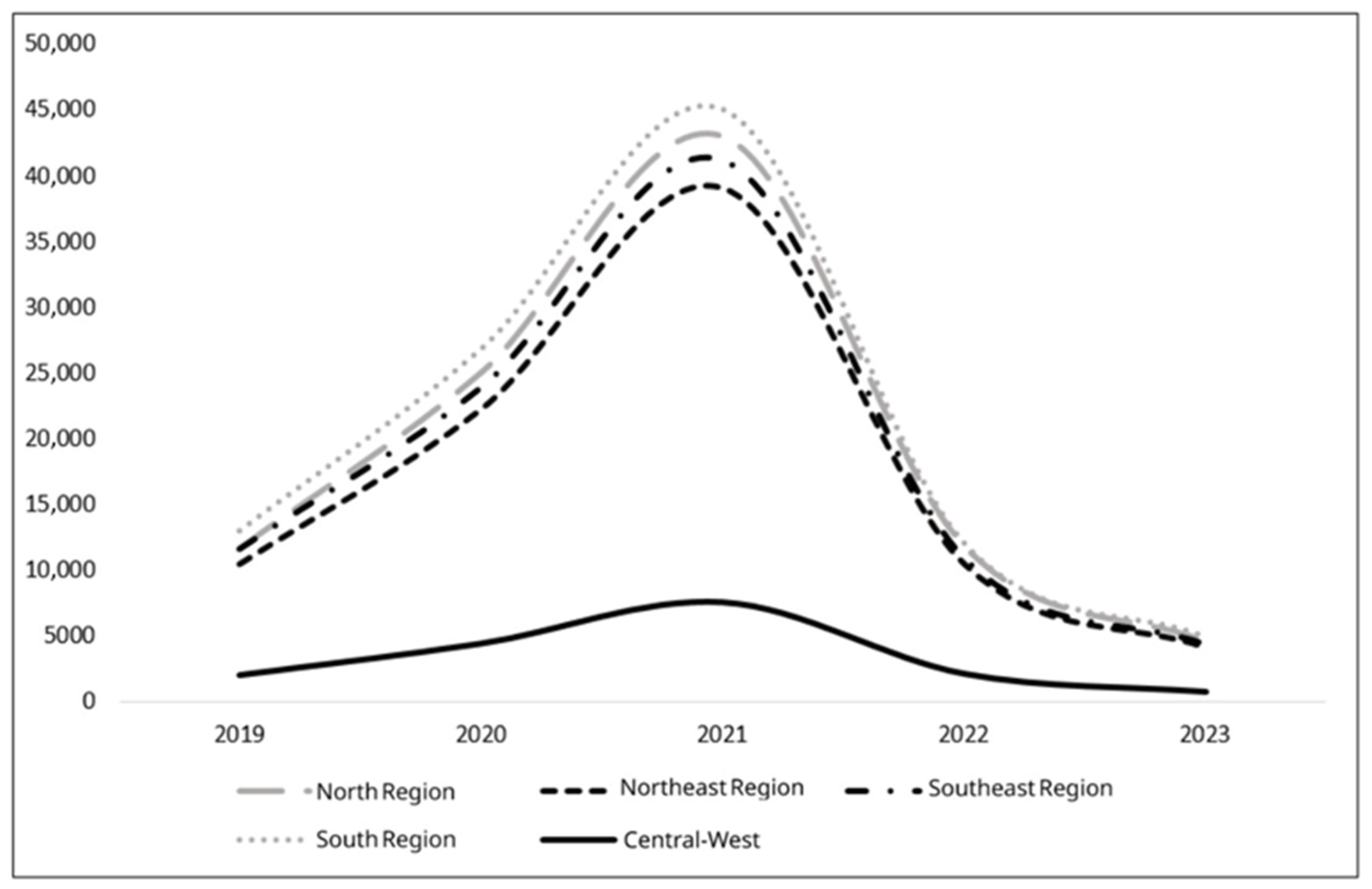 Figure 1, which illustrates the temporal distribution of tuberculosis cases by region of Brazil from 2019 to 2023, highlighting the pandemic’s peak impact.