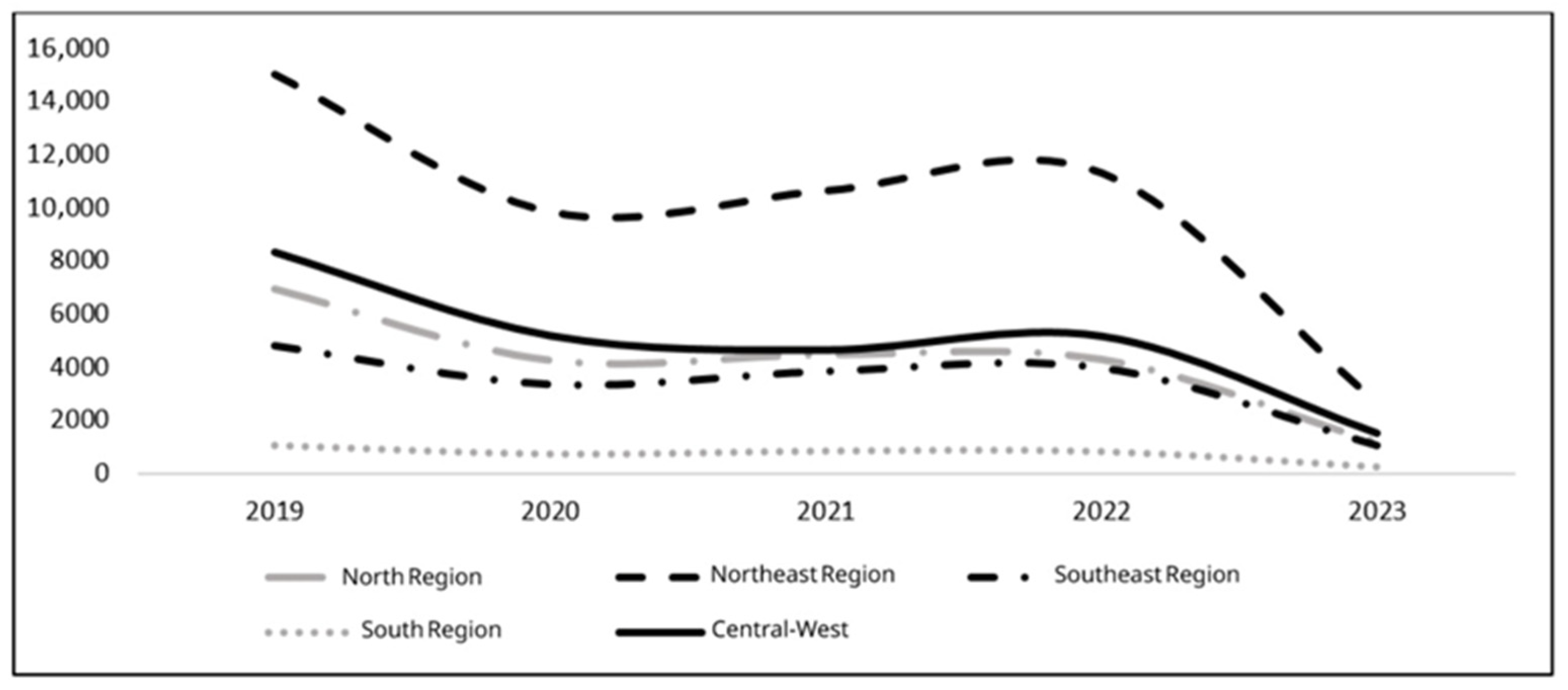 The trend in leprosy diagnoses from 2019 to 2023 revealed a slight overall decline, differing from the pattern observed for tuberculosis. Between 2020 and 2021, leprosy diagnoses decreased by 15%—likely reflecting the impact of COVID-19—followed by a recovery in most regions, except in the Southeast. Across the study period, leprosy cases were unevenly distributed throughout Brazil, with the Northeast (12,000–14,000 cases/year) and North (8000–10,000 cases/year) together accounting for 70–80% of national diagnoses. The Southeast experienced a 33% reduction, while the South and Central-West consistently presented the lowest case volumes (2000–4000 annually). In 2023, the Northeast and North reported further reductions of 5% and 8%, respectively. These findings are depicted in