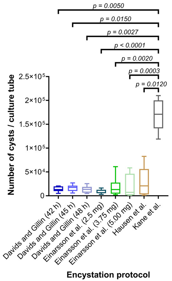 By conducting the encystation protocol based on the publication of Kane et al. [20], we produced a significantly higher number of cysts resistant against water lysis per tube (p < 0.05; p < 0.01; p < 0.001; p < 0.0001) compared to all other protocols (Figure 1).