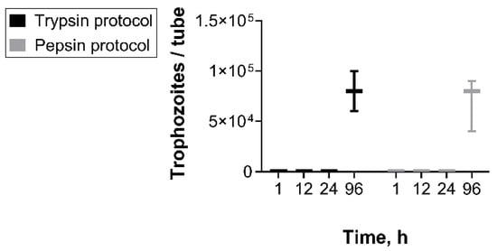 Former studies have proven that in vitro excystation of Giardia cysts is possible by using different protocols [24,25,31,32,33]. In our hands, the amount of trophozoites was first measurable 96 h after initiating excystation. We observed no significant differences between both protocols (Figure 2).