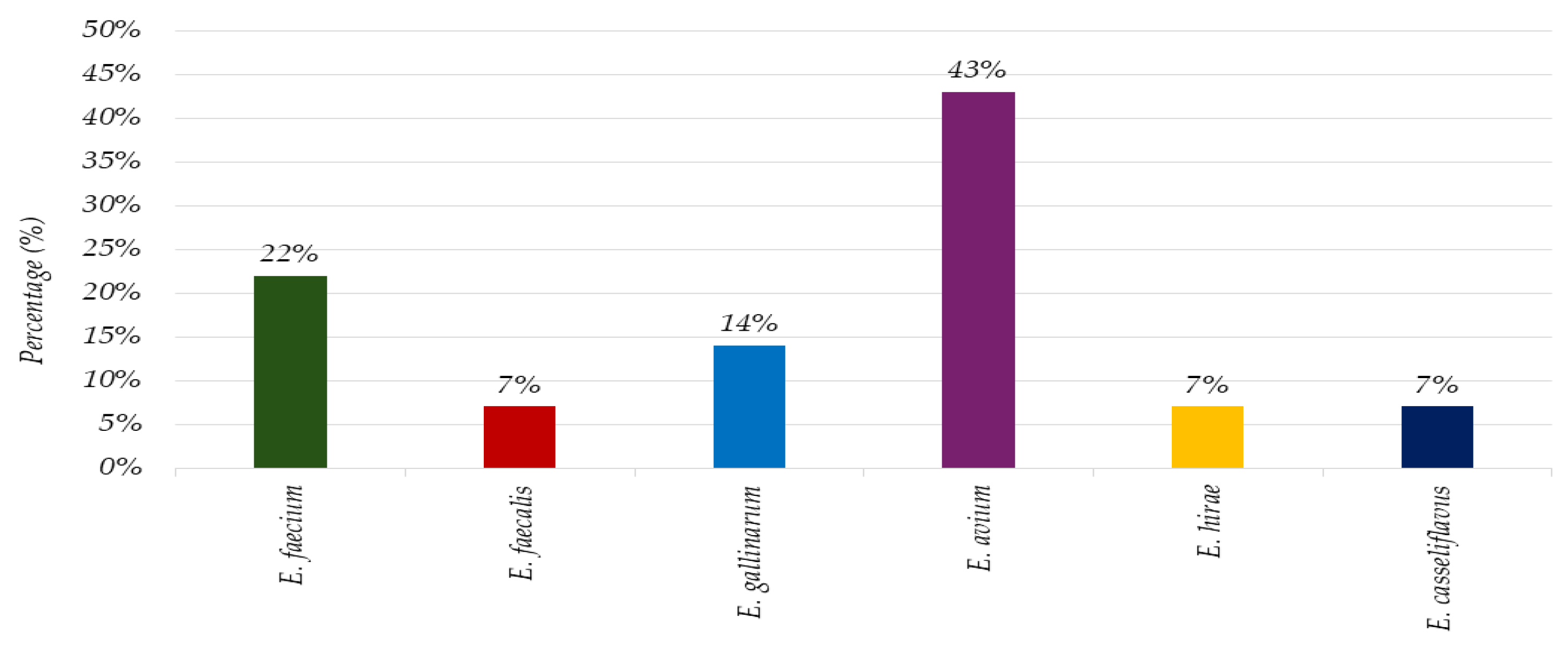 | E. avium n = 1 | R | 0 (0%) | 1 (100%) | 0 (0%) | 0 (0%) | 0 (0%) | 0 (0%) | 0 (0%) | 1 (50%) |