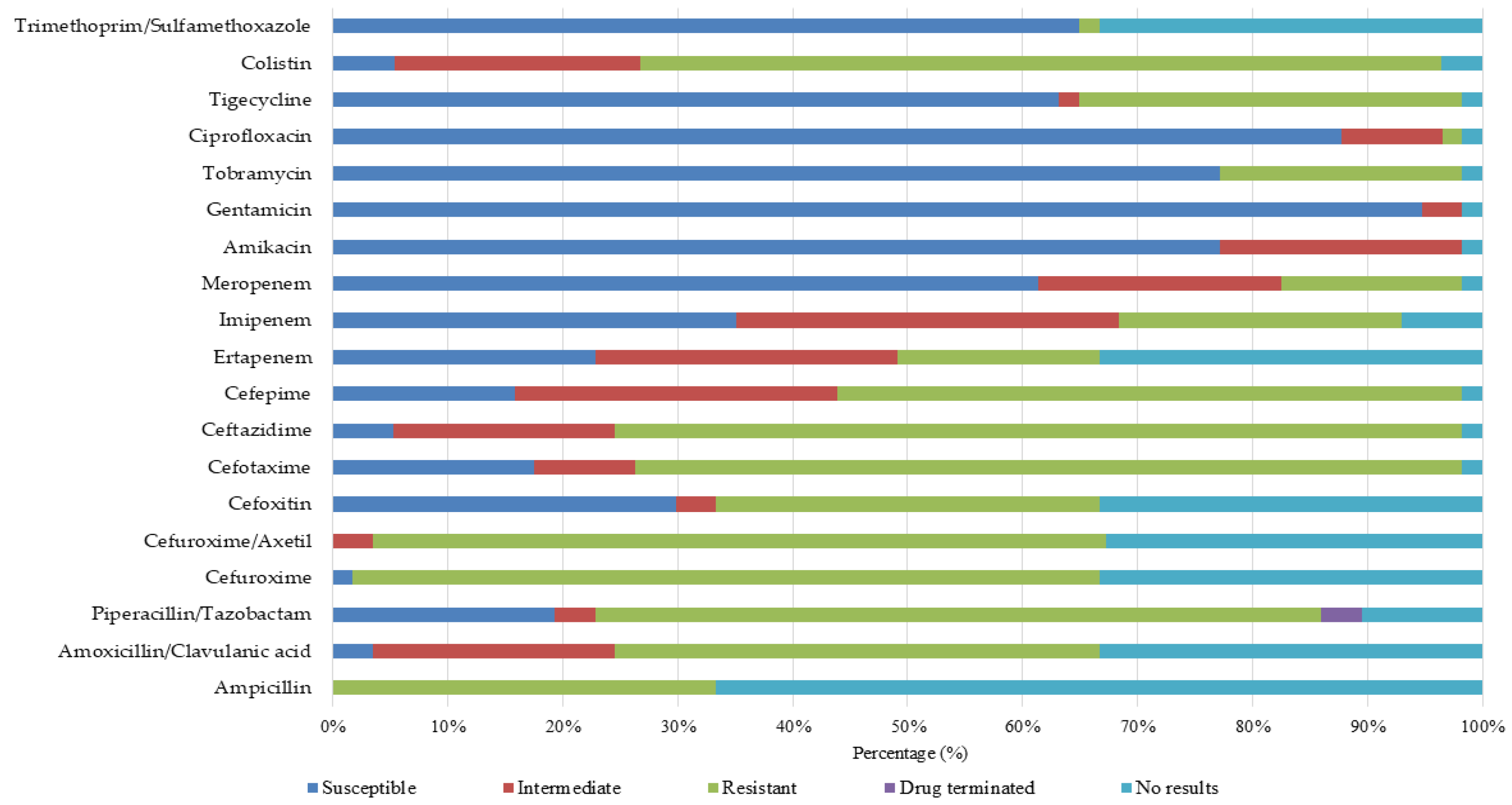 | K. oxytoca n = 9 | R | 9 (100%) | 4 (44%) | 3 (33%) | 9 (100%) | 8 (89%) | 2 (22%) | 2 (22%) | 2 (22%) | 2 (22%) | 0 (0%) | 0 (0%) | 0 (0%) | 0 (0%) | 0 (0%) | 6 (67%) | 0 (0%) | 0 (0%) | 8 (89%) | 0 (0%) |