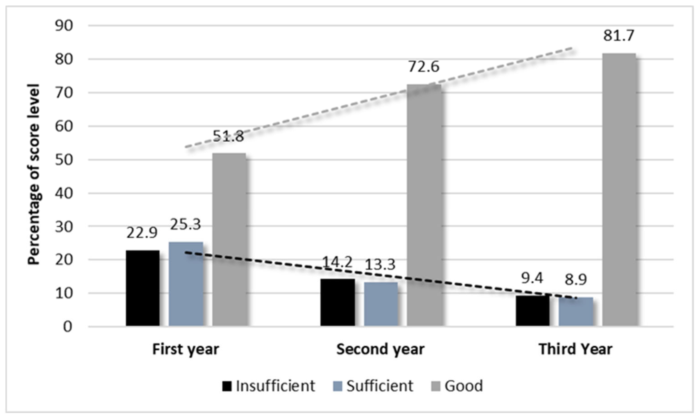 | I year 178 (33.6%) | II year 188 (35.5%) | III year 164 (30.9%) | I year 57 (64.8%) | II year 22 (25.0%) | III year 9 (10.2%) | I year 19 (35.2%) | II year 15 (27.8%) | III year 20 (37.0%) | |