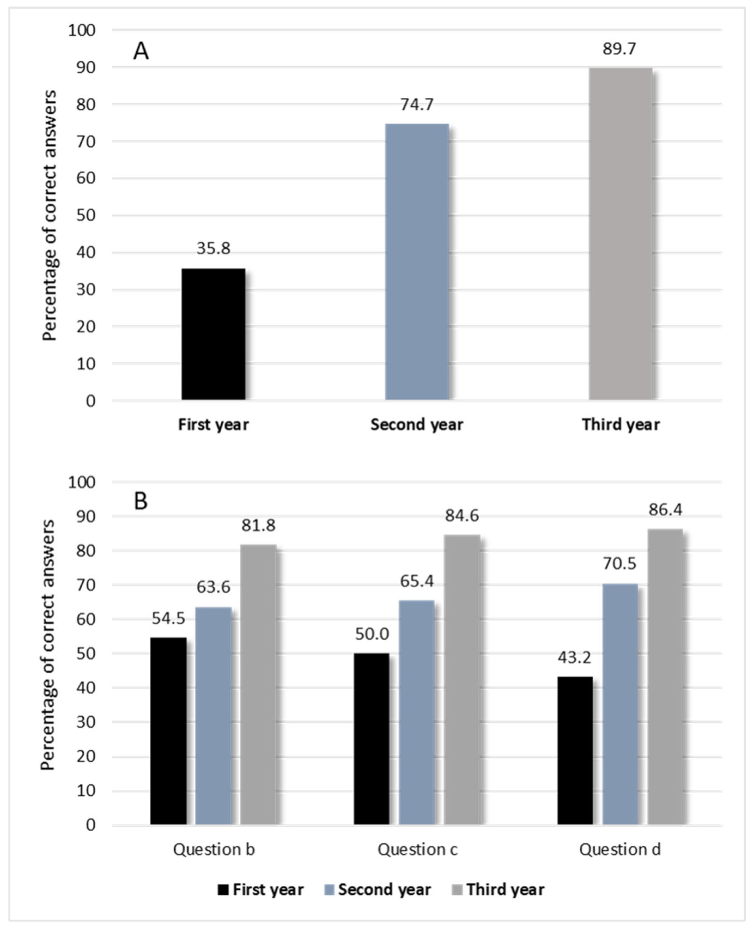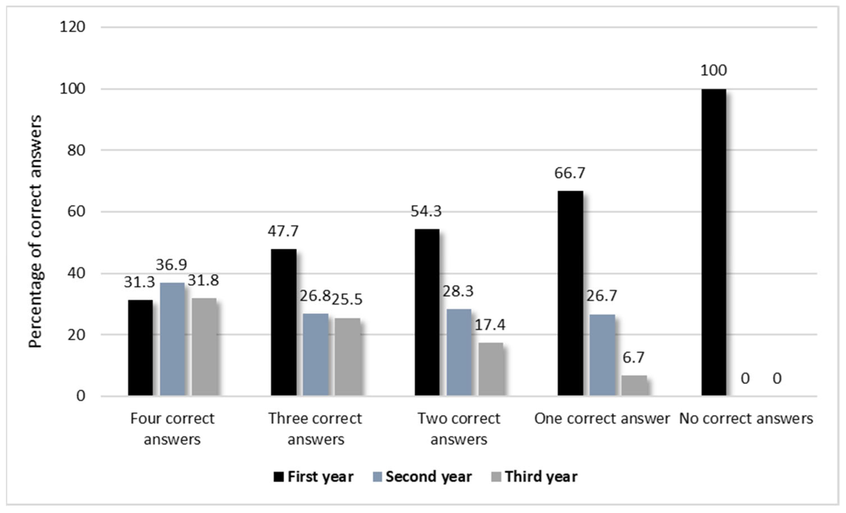 | I year 3 (75.0%) | II year 0 (0.0%) | III year 1 (25.0%) | |