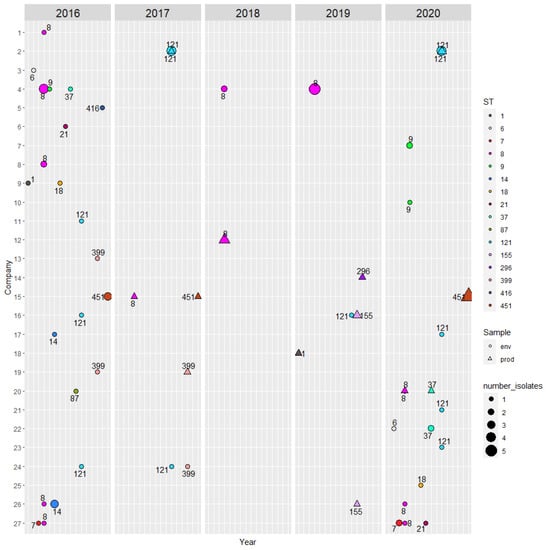 Overview of the number of L. monocytogenes isolates from the participating companies according to different STs and sampling year. Only the companies (27/53) that harboured at least one positive isolate either in product (prod) or environmental (env) samples are shown.