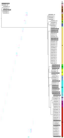 Phylogenetic tree of 85 Listeria monocytogenes isolates taken from food production environment and products of 27 companies between 2016 and 2020, based on SNP analyses. The first two digits indicate the sampling year (16–20) and the last two digits indicate the company ID; no highlight and grey highlight indicate environmental and product samples, respectively; STs are showed in the right column with colour.