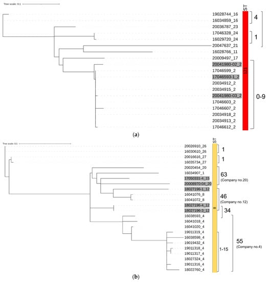 SNP-based phylogenetic trees and SNP-differences of L. monocytogenes isolates belonging to (a) ST121 and (b) ST8. The first two digits indicate the sampling year (16–20) and the last two digits indicate the company ID; no highlight and grey highlight indicate environmental and product samples, respectively; STs are showed in the right column with colour; and SNP differences between selected isolates are shown as numbers on the right.
