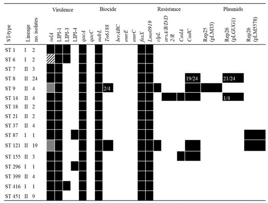 Presence of selected elements and genes associated with virulence, biocide and antibiotic resistance and plasmids in the isolates belong to the different STs. Gray cells in internalin A (inlA) indicate presence of premature stop codons and diagonal shading indicates inconclusive result. The numbers in cells indicate the number of isolates which contained the genes out of the total number of isolates.
