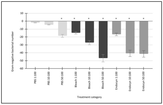 The responses of Gram-negative bacterial species were also similar to each other (Figure 2). More specifically, the administration of the negative control (1x PBS) resulted in a reduction in both the turbidity and cell counts of the Gram-negative bacteria, which responded similarly and led to average reductions of −2.0% (1:100 PBS), −4.4% (10:100 PBS), and −18.6% (50:100 PBS), p = 0.712 to p = 0.024. Furthermore, the administration of the positive control (5% NaOCl or bleach) also reduced the turbidity and cell counts among Gram-negative bacteria by averages of −14.8% (1:100 bleach), −27.2% (10:100 bleach), and −46.9% (50:100 bleach), p = 0.041 to p = 0.001. In addition, the administration of Endocyn similarly reduced the turbidity and cell counts among Gram-negative bacteria by −16.7% (1:100 Endocyn), −40.7% (10:100 Endocyn), and −41.4% (50:100 Endocyn), p = 0.04 to p = 0.001.