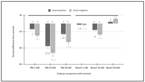 Gram-negative bacterial responses to the administration of Endocyn and experimental controls. The negative control (1x PBS) reduced the turbidity and cell counts of the Gram-negative bacteria by between −2.0% and −18.6% (p = 0.712 to p = 0.024) on average over the concentration range tested compared with the baseline (0:100). The positive control (5% NaOCl or bleach) led to larger reductions ranging from −14.8% to −46.9% (p = 0.041 to p = 0.001), while Endocyn elicited similar reductions of between −16.7% and −41.4% (p = 0.04 to p = 0.001) compared with the baseline. * Denotes the statistical significance of p-values less than alpha = 0.05.