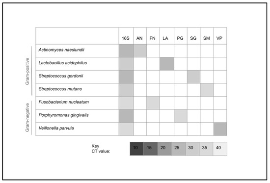 DNA screening using qPCR screening and analysis. All experimental cultures expressed bacterial DNA (16S rRNA). In addition, all Gram-positive (Actinomyces naeslundii, Lactobacillus acidophilus, Streptococcus mutans, Streptococcus gordonii) and Gram-negative (Fusobacterium nucleatum, Porphyromonas gingivalis, Veillonella parvula) bacterial species were screened and validated without evidence of cross contamination from the other concurrently cultured bacteria. CT = qPCR cycle threshold value.