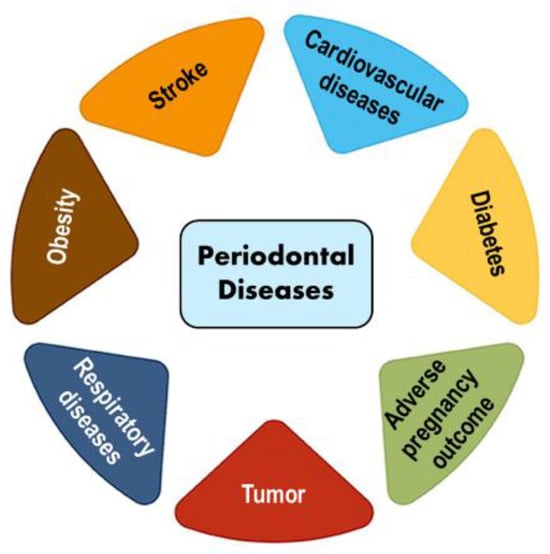 - Martínez-García, M.; Hernández-Lemus, E. Periodontal Inflammation and Systemic Diseases: An Overview. Front. Physiol. 2021, 27, 709438. [Google Scholar] [CrossRef] [PubMed Central]