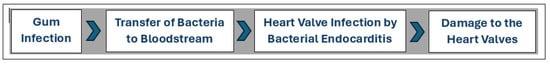 Heart Valve Infection by Bacterial Endocarditis: Infective endocarditis (IE) is caused by bacteria that can seed the heart valves and cardiac devices (Figure 2). The oral microbiome is a significant risk factor for IE. Dental procedures and periodontal disease are associated with IE. The dissemination of periodontal pathogens and subsequent low-grade chronic inflammation are risk factors for cardiovascular disease []. Common oral pathogens that cause IE are the species Staphylococcus and Streptococci viridines. Patients with cardiac conditions, like valve replacement, congenital heart disease, and a previous history of IE, are at higher risk []. Acquired or congenital heart diseases damage the endothelial lining, increasing the risk of developing IE. A loss of endothelial integrity and the subsequent disruption of the inner cell layer induce platelet-derived thrombus formation with the consequent activation of the corresponding inflammatory cascade. Subsequently, microorganisms gain access to the bloodstream causing bacteremia []. In IE, microorganisms adhere to the cardiac endothelium and trigger an inflammatory process.