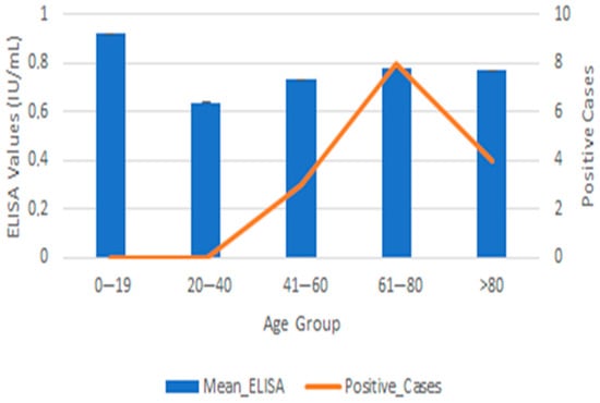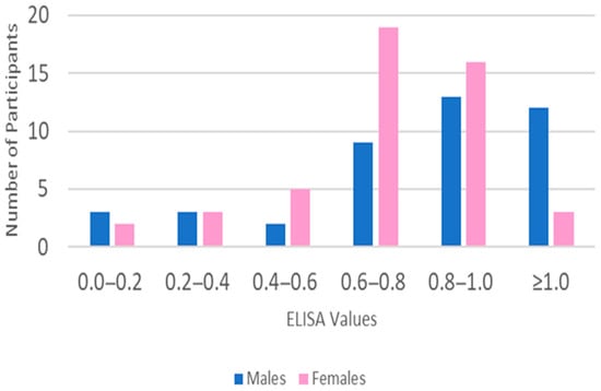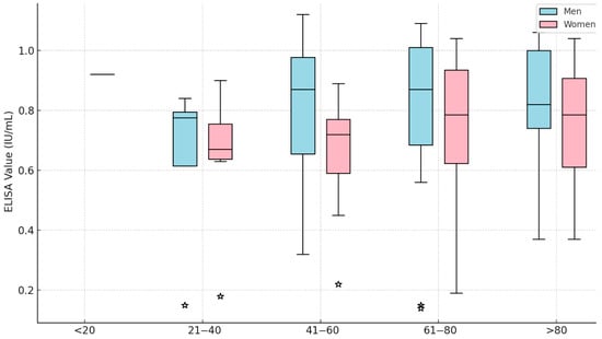 A gender-specific analysis by age group was conducted. Statistical comparison of ELISA values between genders within each age group revealed significant differences only in the 41–60 year-old group. Specifically, males in this age group demonstrated higher mean ELISA values (0.804 ± 0.248 IU/mL, n = 10) compared to females (0.650 ± 0.196 IU/mL, n = 9; p < 0.05, Mann–Whitney U test). No significant gender differences were observed in other age groups: 20–40 years: males 0.635 ± 0.281 vs. females 0.638 ± 0.224 (p > 0.05); 61–80 years: males 0.811 ± 0.274 vs. females 0.744 ± 0.225 (p > 0.05); >80 years: males 0.787 ± 0.241 vs. females 0.756 ± 0.201 (p > 0.05) These findings suggest that gender-related occupational exposure differences may be most pronounced in middle-aged adults (see Table 2).