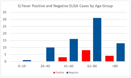 Distribution of ELISA test results by age group for Q fever. Note: Figure 3 illustrates the distribution of ELISA test results by age group for Q fever, with positive results represented in red and negative results in blue. The age groups 61–80 and 41–60 exhibit the highest number of positive cases, corresponding to 7 and 4 individuals, respectively. The 61–80 group also has the largest overall count of participants, indicating significant representation. In contrast, the youngest (0–19) and second-youngest (20–40) age groups show no positive cases, highlighting lower exposure or risk in these demographics. The results emphasize a potential age-related trend, where middle-aged and older adults demonstrate higher positivity rates, likely due to increased exposure to Q fever risk factors such as agricultural or flood recovery activities.