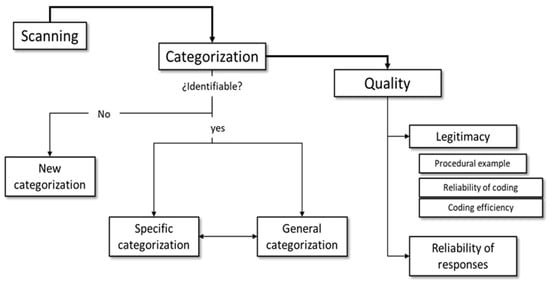 First, a scan of the content was made, which consisted of reading each response to become familiar with the extent and variety of the responses. This stage procedurally coincides with traditional qualitative categorization and the TEMEP technique [30].