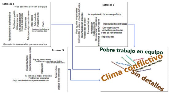 Word cloud of responses regarding the three stress triggers and emerging categories. Note: The figure shows word clouds generated from participant responses describing three different stressor groups, with all terms displayed in Spanish, the original language of data collection. The figure includes specific words or phrases reported for each stressor and highlights the main emergent categories across groups: Poor teamwork (Pobre trabajo en equipo), conflictive climate (Clima conflictivo), lack of detail (Sin detalles), unmotivating tasks (Tareas no motivantes), anxiety effect (Efecto ansiedad), physical fatigue effect (Efecto cansancio físico), effect on alertness (Efecto sobre la vigilancia), extra-work factor (Factor extra-laboral), and job insecurity (Inseguridad en el trabajo).