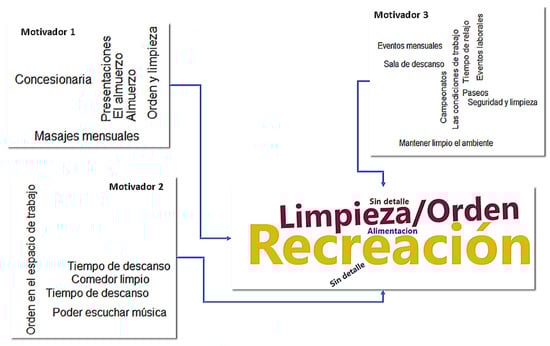 Word cloud of responses regarding the three drivers of engaging factors at work and emerging categories. Note: The figure shows word clouds generated from participant responses describing three different stressor groups, with all terms displayed in Spanish, the original language of data collection. The figure includes specific words or phrases reported for each stressor and highlights the main emergent categories across groups: Recreation (Recreación), Cleaning/Tidying (Limpieza/Orden), Food (Alimentos), Lack of detail (Sin detalle).