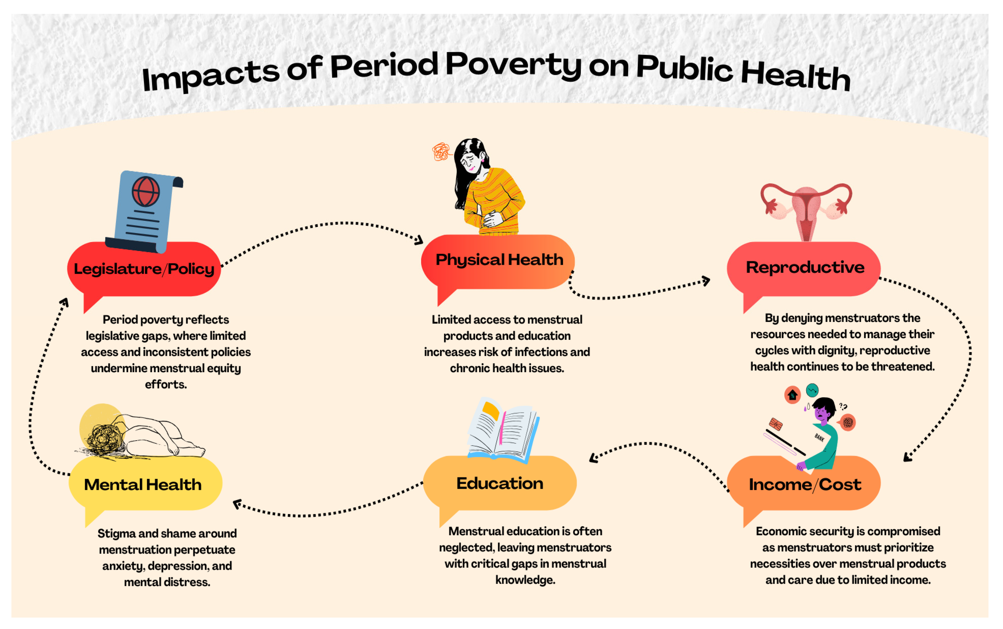 The growing widespread effects of period poverty among menstruating individuals who are Black, Hispanic or of low income within the United States, ranging from reduced academic performance to diminished physical and mental health of persons affected; this makes it a concerning public health and social justice issue. Combating it will require a combination of legislative reforms, increased funding, and widespread education. Ultimately, addressing period poverty is not only about hygiene, but also about ensuring dignity, equality, and opportunity for all who menstruate. Moreover, the COVID-19 pandemic compounded the issue of period poverty due to increased unemployment, job losses and fiscal barriers to accessing needed menstrual products, with Black and Hispanic menstruators particularly affected [21].