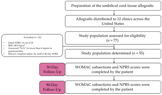 Umbilical cord tissue allografts were obtained by 12 clinics. The allograft application was administered as an intra-articular knee application by anteromedial approach under ultrasound by a qualified health professional in a private medical setting. Patients were asked to fill out an initial questionnaire consisting of NPRS and WOMAC. Patients answered this same questionnaire at 30 days and 90 days after the initial allograft application. A qualitative flow diagram of the study procedures can be referenced in Figure 1.
