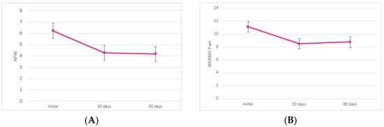 The study population consisted of 55 patients (37 females and 18 males) with a mean age of 73 ± 2.2 years and a mean BMI of 29.6 ± 2.1 kg/m2. In total, 20 patients received supplementation in the left knee and 35 patients in the right knee. NPRS and WOMAC values were collected at initial application, 30 days, and 90 days for each patient. Changes from baseline (initial application date) for all scores at 30 and 90 days were reported in most patients. The average of NPRS and WOMAC subsection sums are reported in Table 1 and Figure 2.