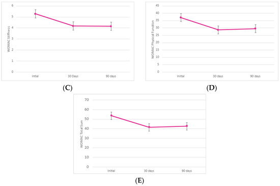 National Pain Rating Scale (NPRS) and Western Ontario and McMaster Universities Arthritis Index (WOMAC) scores reported at initial application, 30-day visit, and 90-day visit. Average sum ± standard deviation reported for (A) NPRS, (B) WOMAC pain, (C) WOMAC stiffness, (D) WOMAC physical function, and (E) WOMAC total sum.