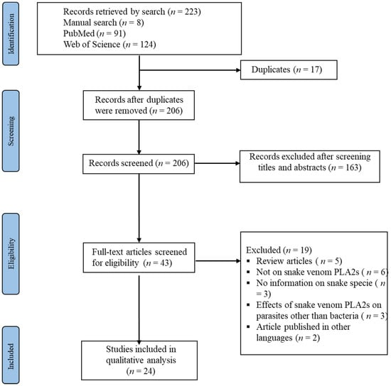 We included only original articles published in the English language that reported the bactericidal effect of snake venom PLA2s in our review. The study excluded reviews, articles on bactericidal effects of snake venoms’ fractions other than PLA2s, those published in a language other than English, and studies that employed the use of commercial venoms in which the snake specie information was not mentioned, as well as studies involving the effects of venoms on other parasites instead of bacteria.