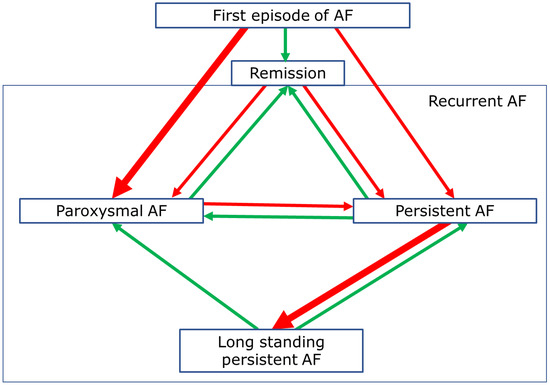 Classification of atrial fibrillation based on its temporal pattern. Red arrows indicate deterioration, green arrows indicate improvement. The width of the arrows represents the most common clinical course. After a first episode, AF commonly becomes paroxysmal. Remission or primary persistent AF may occasionally occur. Paroxysmal AF may remain paroxysmal, go into remission, or progress into persistent AF. Persistent AF, if not treated effectively, becomes long-standing persistent AF. Without active treatment, persistent or long-standing persistent AF almost never improves to the paroxysmal form or remission.