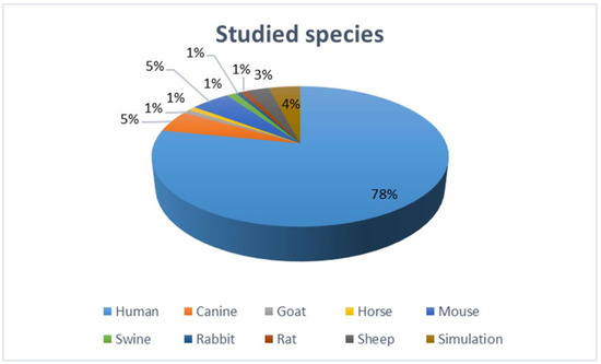 Species analyzed in the cited literature. One study may have investigated more than one species. The majority (78%) of the studies investigated human experimental or clinical processes. Several studies (4%) included mathematical models and simulations. Canine and mouse models were the most studied animal models of persistent AF in the past 10 years (5% each).