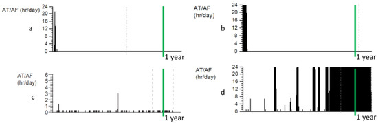 Examples of the clinical course of AF in patients with implanted dual chamber cardiac pacemakers or defibrillators. These devices provide the capability of continuous heart rhythm monitoring after implant. Pacing provides treatment for symptomatic bradycardia and may also enable the use of medical or non-pharmacological treatment for AF if a low heart rate was limiting their use prior to the device implant. One-year follow-up is marked with the green line. Daily AF burden varies from 0 to 24 h. (a) Remission of paroxysmal atrial fibrillation a few weeks after device implant. (b) The pacemaker was implanted in a patient with persistent atrial fibrillation. Cardioversion was performed several weeks after the implant, and the AF remained in remission thereafter. (c) Paroxysmal atrial fibrillation with a stable burden after implant. (d) Progression of paroxysmal AF into persistent AF.