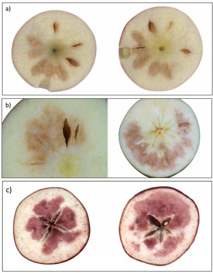 Symptomatic fruit with CO2 injury-related internal flesh browning disorders: (a) CO2 injury in ‘Scilate’, and (b) ‘Honeycrisp’ [adapted from—Contreras et al. [98]] and (c) brown heart in apples [adapted from—Cross et al. [99]].