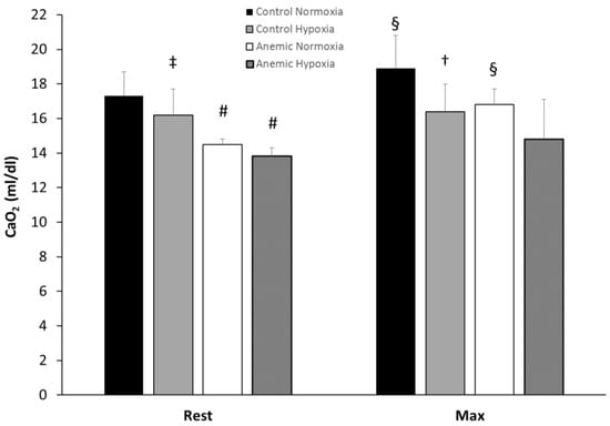 Mean (± sd) values of arterial oxygen content (CaO2) at rest and at maximal exercise in the two study groups (control, n = 8; anemic, n = 8) under normoxia (FIO2 0.21) and hypoxia (FIO2 0.14). # p < 0.001: different from control in the same condition; † p < 0.05, ‡ p < 0.01: different from normoxia in the same group; § p < 0.001: different from rest in the same group and condition.
