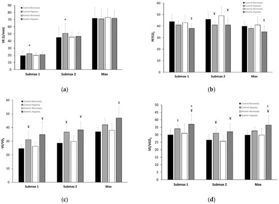 Mean (±sd) values of ventilatory variables ((a) VE, (b) PETCO2, (c) VE/VO2, and (d) VE/VCO2) in the two study groups (control, n = 8; anemic, n = 8) at submaximal (Sub max1: at 40% of the condition’s VO2 max; Sub max2: at 80% of the condition’s VO2 max) and maximal (Max) exercise under normoxia (FIO2 0.21) and hypoxia (FIO2 0.14). * p < 0.05: different from control in the same condition; † p < 0.05, ‡ p < 0.01, ¥ p < 0.001: different from normoxia in the same group.