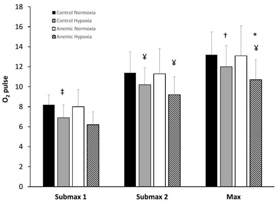 Mean (±sd) O2 pulse in the two study groups (control, n = 8; anemic, n = 8) at submaximal (Sub max1: at 40% of the condition’s VO2 max; Sub max2: at 80% of the condition’s VO2max) and maximal (Max) exercise under normoxia (FIO2 0.21) and hypoxia (FIO2 0.14). * p < 0.05: different from control in the same condition; † p < 0.05, ‡ p < 0.01, ¥ p < 0.001: different from normoxia in the same group.