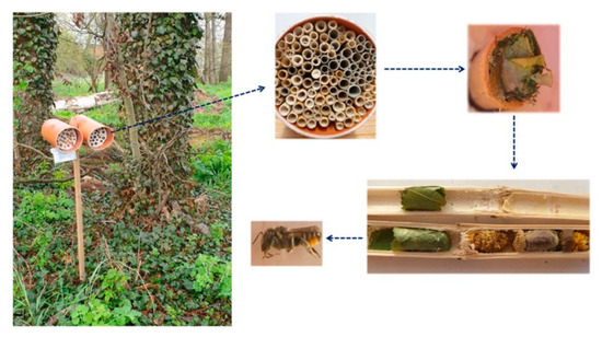 - Staab, M.; Pufal, G.; Tscharntke, T.; Klein, A. Trap nests for bees and wasps to analyse trophic interactions in changing environments—A systematic overview and user guide. Ecol. Evol. 2018, 9, 2226–2239. [Google Scholar] [CrossRef]