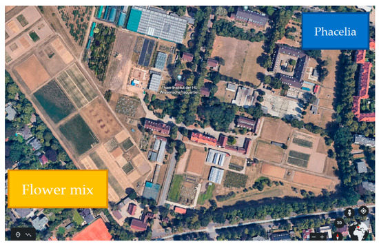 Schematic depiction of Phacelia plot at Free University Berlin (FU) and the flower mix plot at Albrecht Daniel Thaer-Institute (ADTI, HU) (https://www.google.de/intl/de/earth/index.html, accessed on 6 March 2023).