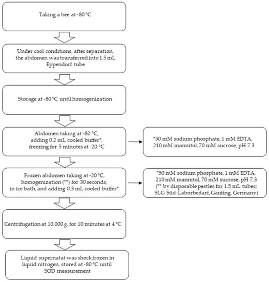 Schematic flow diagram for processing Bombus terrestris and Apis mellifera before superoxide dismutase (SOD) measurement by LABOKLIN.