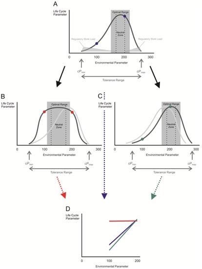 Theoretically, the reaction norm of an animal for a given life cycle parameter (e.g., the growth rate) is defined by two or several points within the tolerance curve. Using only two points of different environmental parameter values results in a linear reaction norm with a certain slope (Figure 1A,D, blue dots or line, respectively). This type of reaction norm is only valid for a given interval of the environmental parameter and may be used to compare the behavior of different individuals from the same or from different populations in their responses to this particular environmental change. However, the linear reaction norm derived from the two points on the tolerance curve provides only simplified information on the response of an animal to environmental change and may miss important alterations in life cycle parameters when the interval of the environmental parameters has been selected in an unfavorable manner. The determination of a reaction norm using several different values of environmental parameters within the tolerance range is more informative. The best way of understanding the responsive behavior of an animal to environmental change is by the construction of a non-linear reaction norm which forms an approximation to the tolerance curve. This requires measurements of different values of the life cycle parameter of interest in small intervals of the environmental parameter within the tolerance range; thus, a lot more experimental work is needed.
