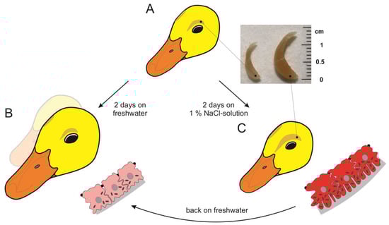 - Ellis, R.A.; Goertemiller, C.C.; DeLellis, R.A.; Kablotsky, Y.H. The effect of a salt water regimen on the development of the salt glands of domestic ducklings. Dev. Biol. 1963, 8, 286–308. [Google Scholar] [CrossRef]