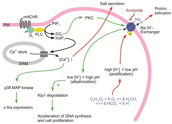 A previous observation might shed some light on a potential mechanism that supports or mediates Kip1 ubiquitinylation and degradation in mAChR-stimulated naïve salt gland cells. Exposing salt gland cells to the muscarinic receptor agonist carbachol elicits responses in cytosolic pH in these cells. The cytosol of cells isolated from salt-stressed animals undergoes slight and transient acidification, most likely resulting from the production of additional protons in the activated oxidative carbohydrate metabolism and a short lag period in the activation of proton extrusion by the sodium/proton exchanger (NHE) (Figure 3). However, when the cells from naïve animals were treated in the same way, they showed a sustained cytosolic alkalinization of 0.1 pH units above the previous level [94]. Such prolonged alkalinization of the cytosol has already been described in other cell types which had been mitotically activated by growth factors [95,96]. Plasma membrane receptors coupled to the activation of phospholipase C generally mediate the production of two types of second messengers in the respective cells: inositol phosphates and diacylglycerol [97]. The latter stays in the cytosolic leaflet of the plasma membrane and activates protein kinase C (PKC). PKC, in turn, phosphorylates an amino acid residue in the C-terminal region of the NHE, which increases the binding affinity of a regulatory proton binding site next to the transport site in this transport molecule. This results in sustained transport activity and cytosolic alkalinization in activated cells [98]. Several authors postulated a causal relationship between cytosolic alkalinization and the initiation of DNA synthesis in preparation for cell proliferation in such cells [95,96,98]. Unfortunately, these reports did not receive much attention. We were able to confirm the relationship of cytosolic alkalinization and the onset of DNA synthesis using mAChR-activated naïve salt gland cells [76]. The pretreatment of cultured salt gland tissue with the NHE inhibitor amiloride suppressed the mAChR-mediated cytosolic alkalinization as well as the increase in the DNA synthesis rate. These results support the hypothesis that mitogenic stimulation of cells and the associated cytosolic alkalinization may have a permissive or a signaling function for the initiation of DNA replication in preparation for cell proliferation, at least in proliferation-competent cells.