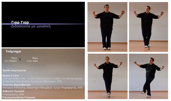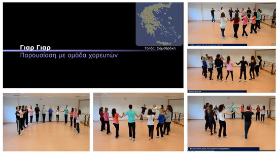 The basic equipment consisted of a computer, a projector, and loudspeakers. The material used to implement the specific dance program was established in a web-based course management system [45], created to support the learning and teaching of Greek traditional dances on the Moodle platform http://ellinikoixoroi.phed.auth.gr (accessed on 10 March 2023). It was posted on the platform on the website “Traditional Dances” and included the basic ethnographic elements of the dance as a theoretical framework (origin, measure, handle) and 3 videos to demonstrate and teach the steps of the dance. This part is divided as follows: