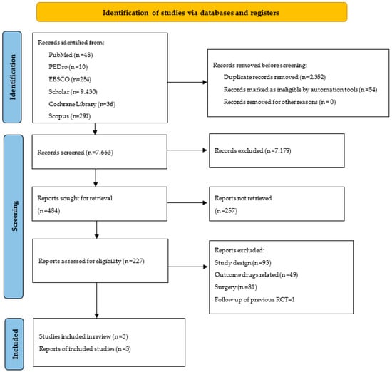 The selection strategy among all database results was conducted as described in Figure 1 (Prisma statement flowchart for databases and registers). The search yielded a total of 10,069 results. Duplicates (n = 2352) and articles unsuitable for automation tools (n = 54) were initially removed. From the remaining 7663 articles, a further 7179 were excluded by reading the title and abstract. The remaining 484 results were searched for full-text screening, and 257 were discarded because the full text could not be found. The full text of 227 articles was screened and, of these, 93 were eliminated as they did not meet the study design, a further 49 studies were eliminated as they considered drug-related outcomes, and a further 81 studies were eliminated as they described a surgical approach to spinal stenosis. Finally, one article was eliminated because it described a 12-month follow-up of a previously included study. Finally, three RCTs were included in the present review.