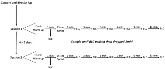 Each participant completed familiarization prior to performing two sprint sessions to measure VLamax over a period of 1 week with each pair of sessions completed at a similar time of day (±3 h) and all sessions after 10 a.m. We allowed no more than 7 days between each test for men and no more than 4 days between tests for women; Figure 2 provides a summary of the testing procedures. While the current consensus of evidence indicates that the menstrual cycle does not alter most physiological measures, including lactate [30,31,32], women were asked to track and then self-report when their menstrual cycle began and ended. Women then completed both tests within the same phase (i.e., follicular or luteal) using their self-reported data. All subjects were tested in their “off-season” training period. They were instructed to maintain their same dietary habits during the study period and were asked to engage in no more than light activity 24 h prior to testing; researchers confirmed training instructions prior to testing, and any athletes reporting significant deviations were rescheduled for testing.