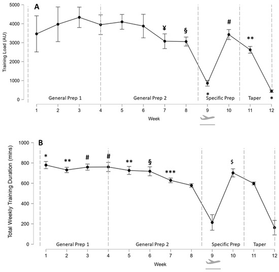 Changes in training load (A) and duration (B) over each of the phases over the course of the 12-week training camp. For (A), * represents significant difference (p < 0.05) with weeks 1–8 and 10, ** represents significant difference (p < 0.05) with weeks 1–6, ¥ represents significant difference (p < 0.05) with weeks 3–5, § represents significant difference (p < 0.05) with weeks 3–6, and # represents significant difference (p < 0.05) with week 3. For (B), * represents significant difference (p < 0.05) with weeks 2 and 5–12; ** represents significant difference (p < 0.05) with weeks 7–12; # represents significant difference (p < 0.05) with weeks 6–12; § represents significant difference (p < 0.05) with weeks 8, 9, and 12; *** represents significant difference (p < 0.05) with weeks 9 and 12; and $ represents significant difference (p < 0.05) with weeks 8, 9, and 12. Mean ± 95% C.I. Note: airplane icon denotes 32 h travel from home country to competition location (11 h time-zone difference).