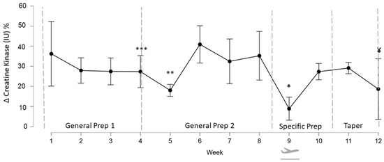 Changes in creatine kinase over the course of the 12-week training camp. * Significant difference (p < 0.05) with all weeks, except weeks 5 and 12. ** Significant difference (p < 0.05) with weeks 1, 2, 6, 7, 8, and 11. *** Significant difference (p < 0.005) with week 6. ¥ Significant difference (p < 0.05) with weeks 1, 6, 7, 8, and 11. Mean ± 95% C.I.