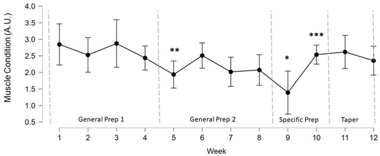 Changes in muscle condition over the course of the 12-week training camp. * Significant difference (p < 0.05) with weeks 1–6, 10, and 11. ** Significant difference (p < 0.05) with week 1. *** Significant difference (p < 0.05) with week 11. Mean ± 95% C.I.