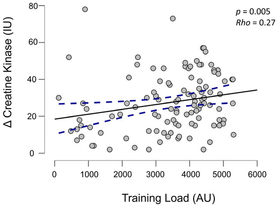 Correlation between training load and change in creatine kinase levels over the 12-week training camp. Mean ± 95% C.I.